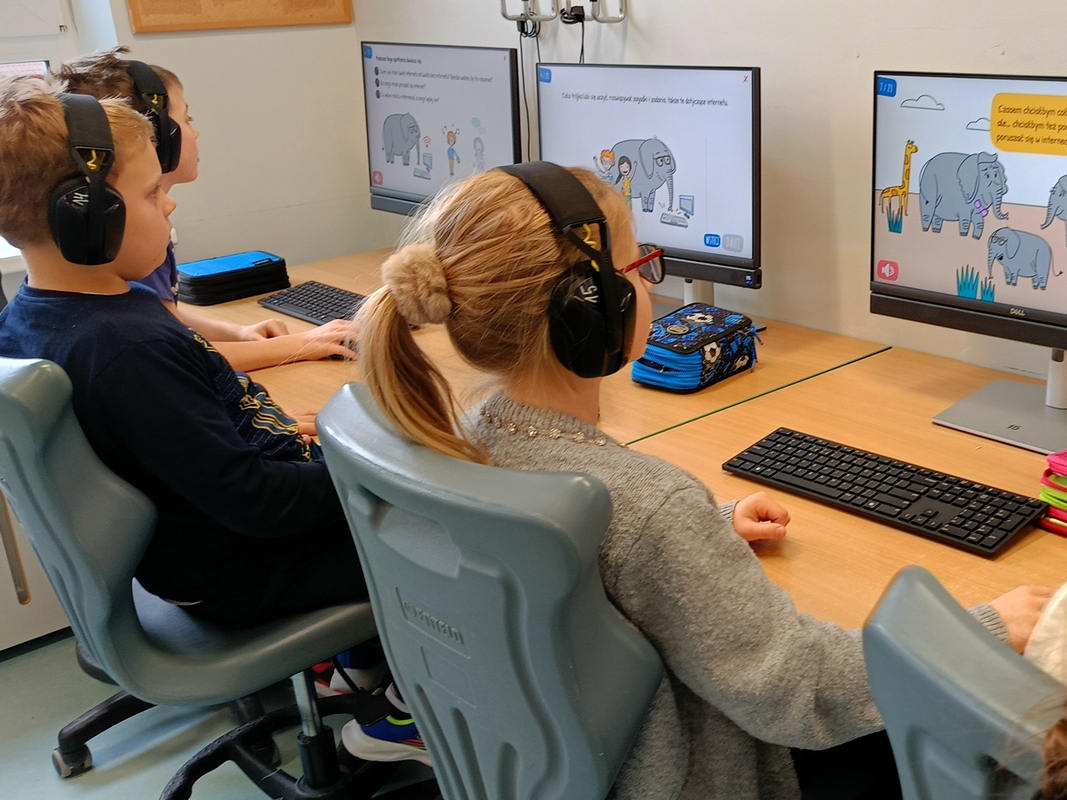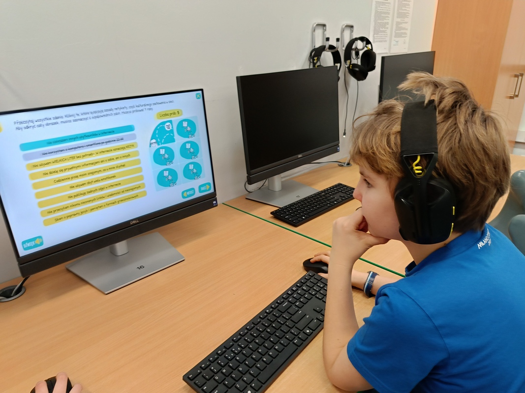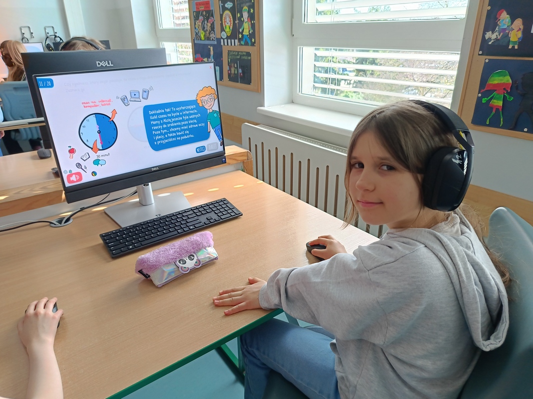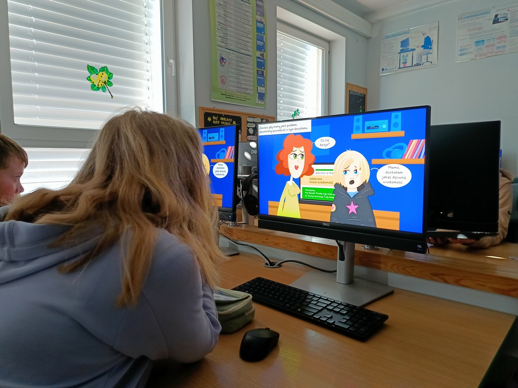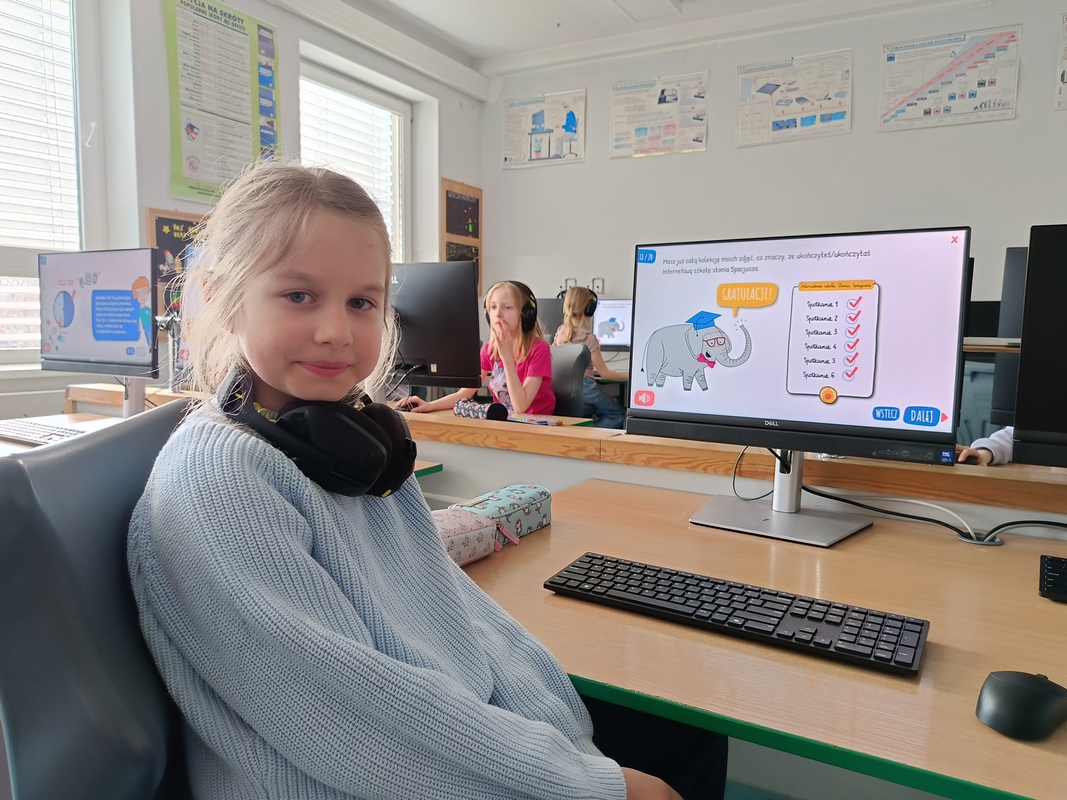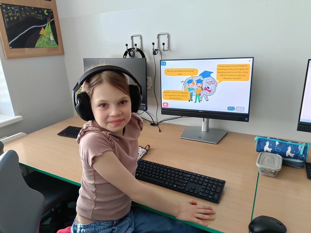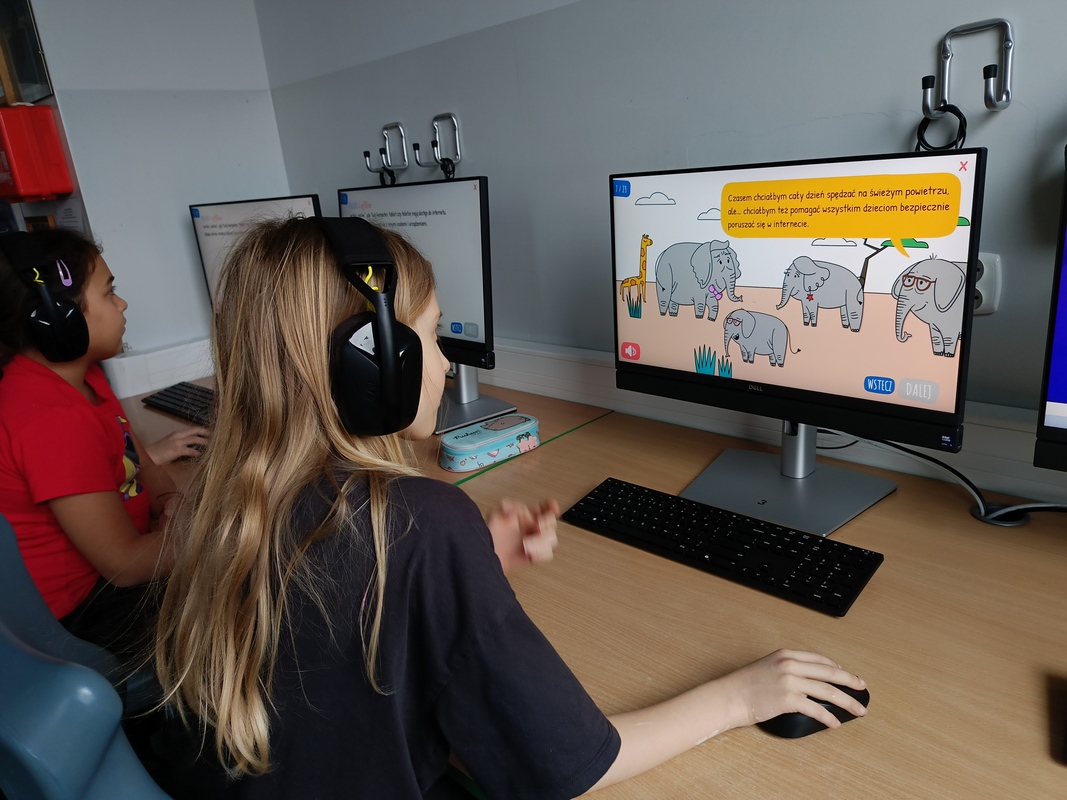 Drugoklasiści przenieśli się do Internetowej Szkoły słonia Spacjusza. Kolorowy, interaktywny, czytany przez lektora kurs okazał się strzałem w dziesiątkę – dzieci z łatwością przyswajały wiedzę o zagrożeniach, zasadach netykiety, reagowaniu na trudne sytuacje i rozpoznawaniu treści nieodpowiednich dla ich wieku. Zajęcia były nie tylko pouczające, ale też bardzo angażujące.