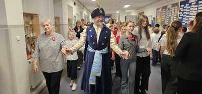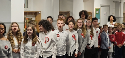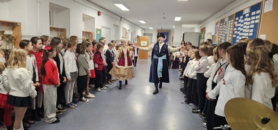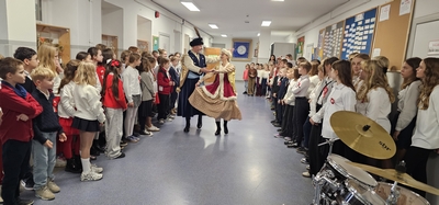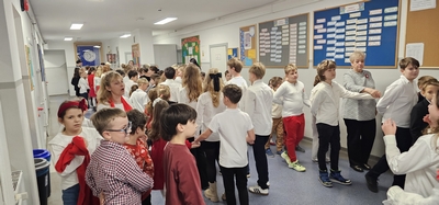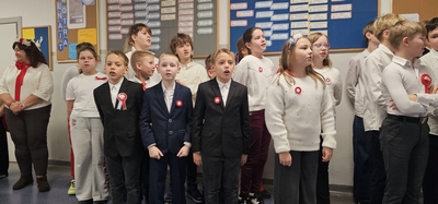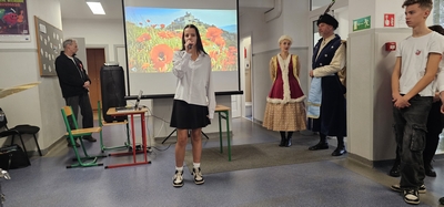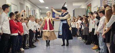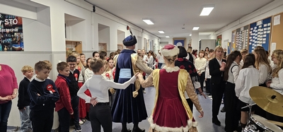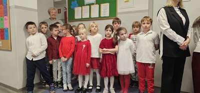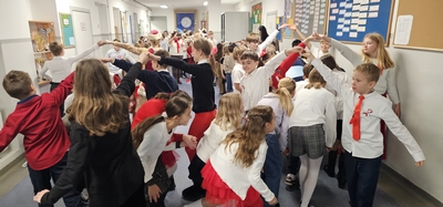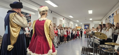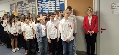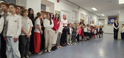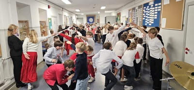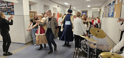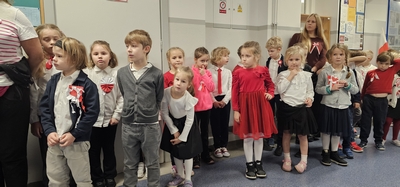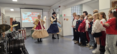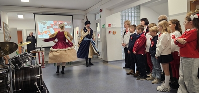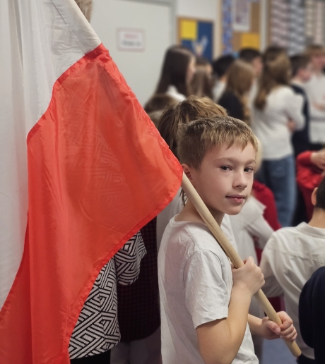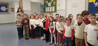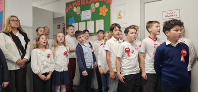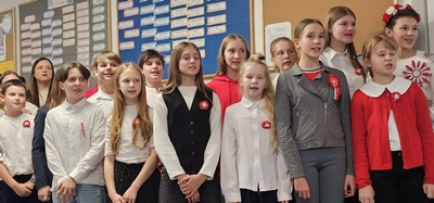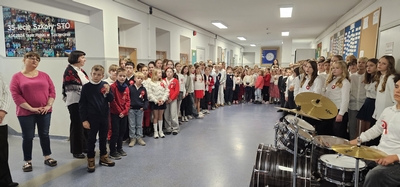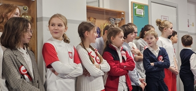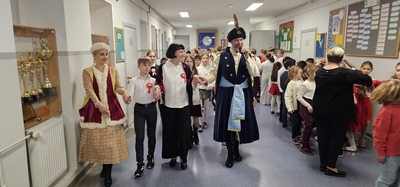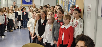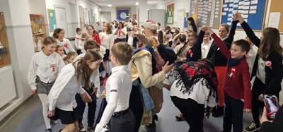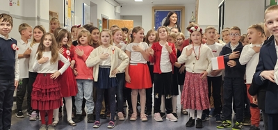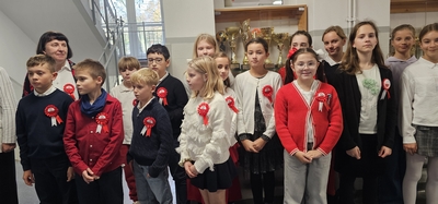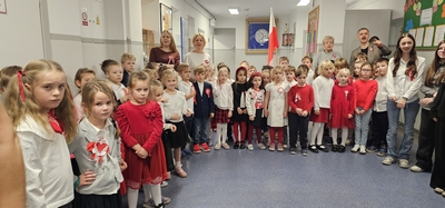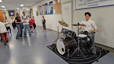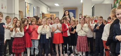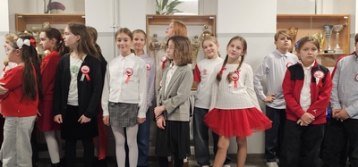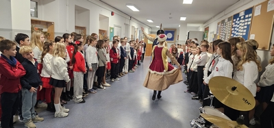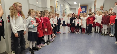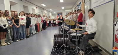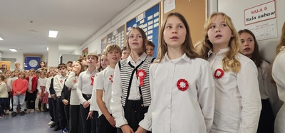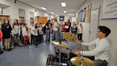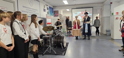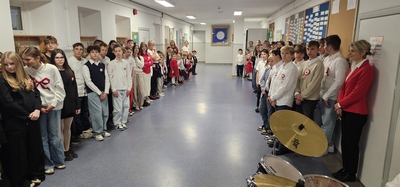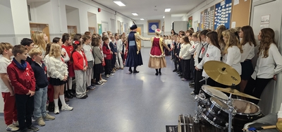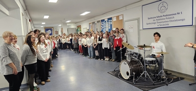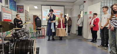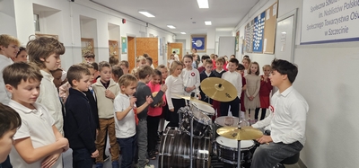Tego dnia cały parter wypełnił się biało-czerwonymi barwami. Uczniowie i nauczyciele ubrani byli w stroje narodowe, a na piersiach dumnie nosili kotyliony. W programie znalazły się znane i lubiane pieśni patriotyczne oraz piosenki nawiązujące do historii naszej ojczyzny, m.in. „Przybyli ułani pod okienko”, „Rozkwitały pąki białych róż”, „Legiony” czy „To jest Polska”. Wspólne śpiewanie połączyło wszystkie pokolenia uczniów – od najmłodszych po ósmoklasistów. Bijące bębny przypominają serce wspólnoty, które jednoczy ludzi w ważnych chwilach. Poprzez dynamiczne rytmy, marszowe tempa czy interpretacje utworów o charakterze narodowym, perkusista może symbolicznie wyrazić szacunek dla historii, bohaterów i tradycji ojczyzny.